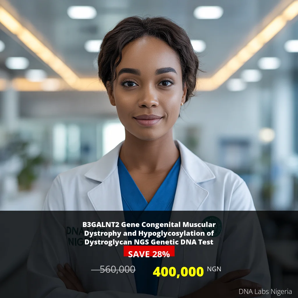 The B3GALNT2 Gene Congenital Muscular Dystrophy and Hypoglycosylation of Dystroglycan NGS Genetic DNA Test is crucial for diagnosing specific neurological disorders. Priced at 400,000 NGN, this test helps identify genetic mutations linked to muscular dystrophy, providing insights for effective management and treatment options.