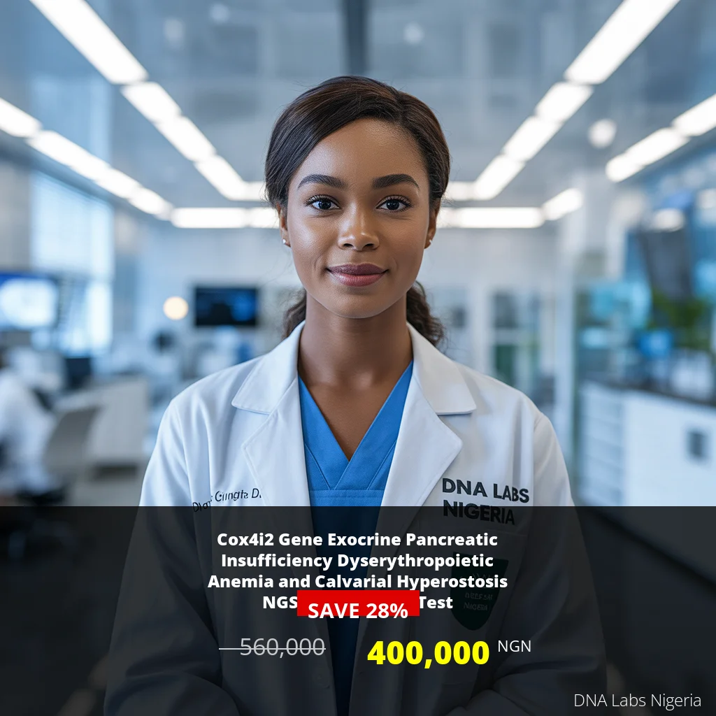 To take control of your health and gain valuable insights, book the Cox4i2 Gene Exocrine Pancreatic Insufficiency Dyserythropoietic Anemia and Calvarial Hyperostosis NGS Genetic DNA Test today! Call or WhatsApp us at +2348110567037 for more information and to schedule your appointment.
